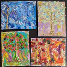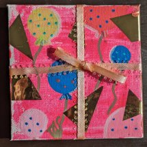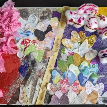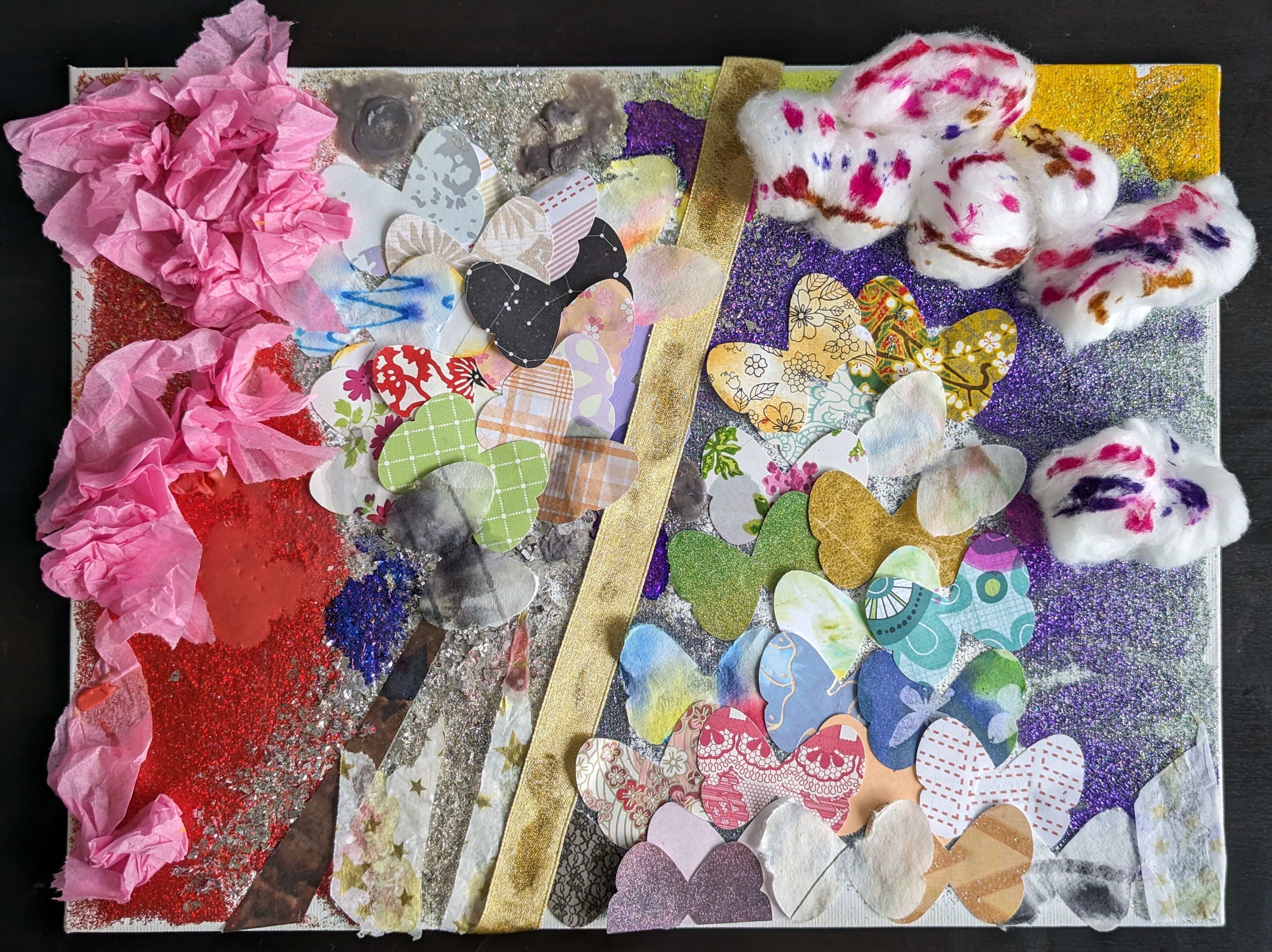 Misc Paper, Paint, Glitter, Ribbons, Cotton balls and Wax on Canvas. Made in 2024..